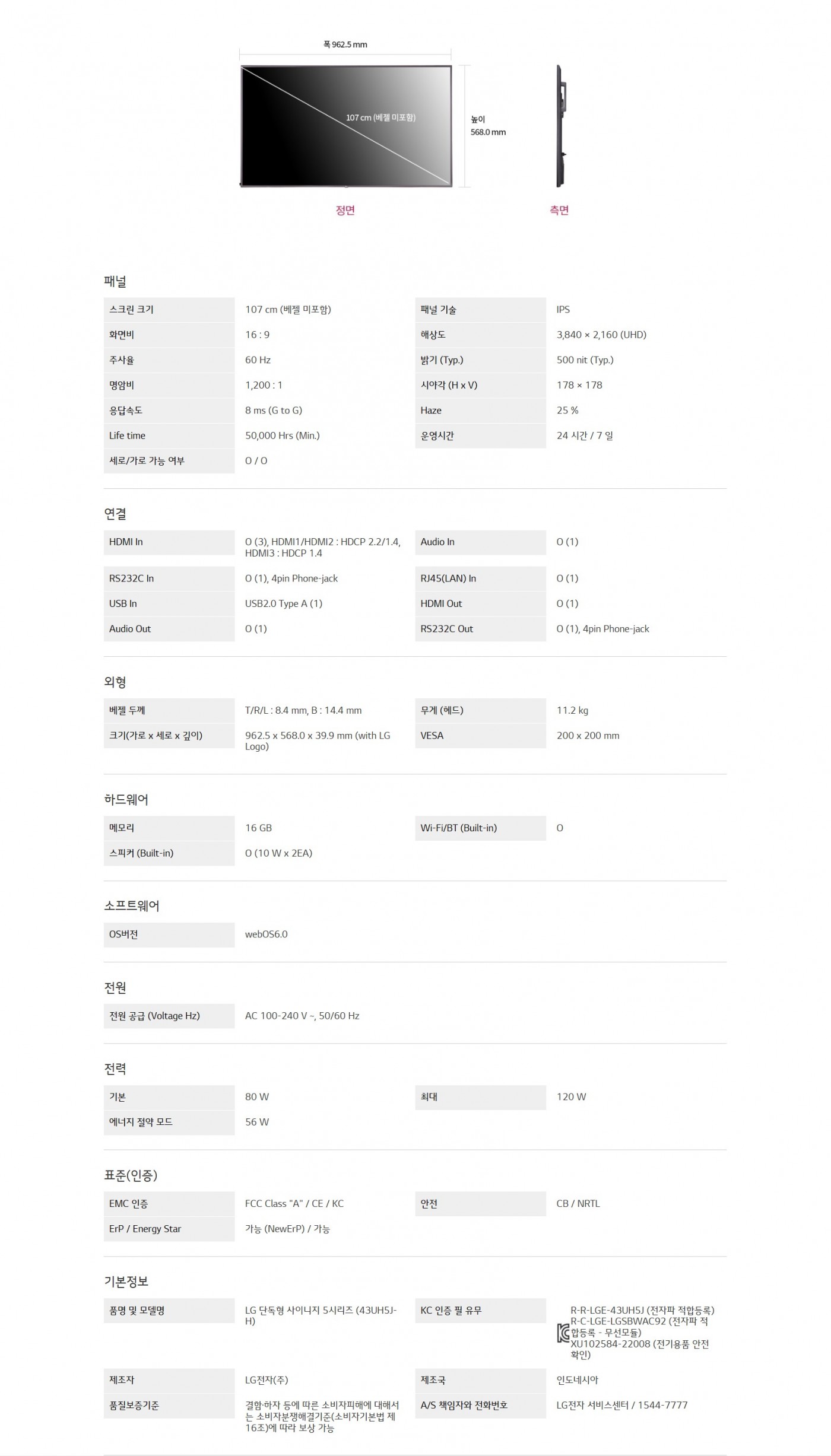 LG 단독형 사이니지 5시리즈 + 벽걸이 브라켓